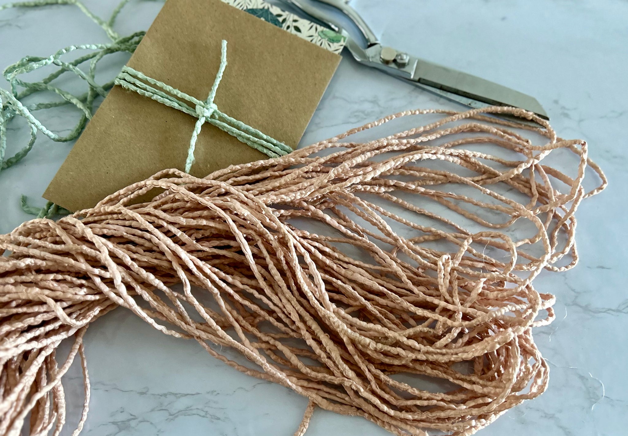 This silk twine has already seen a productive life in India and comes to me from my longtime supplier in India, who gathers and processes the used saris for me which I then carefully hand-dye in single batches with my all-natural dyes to a beautiful range of colour.