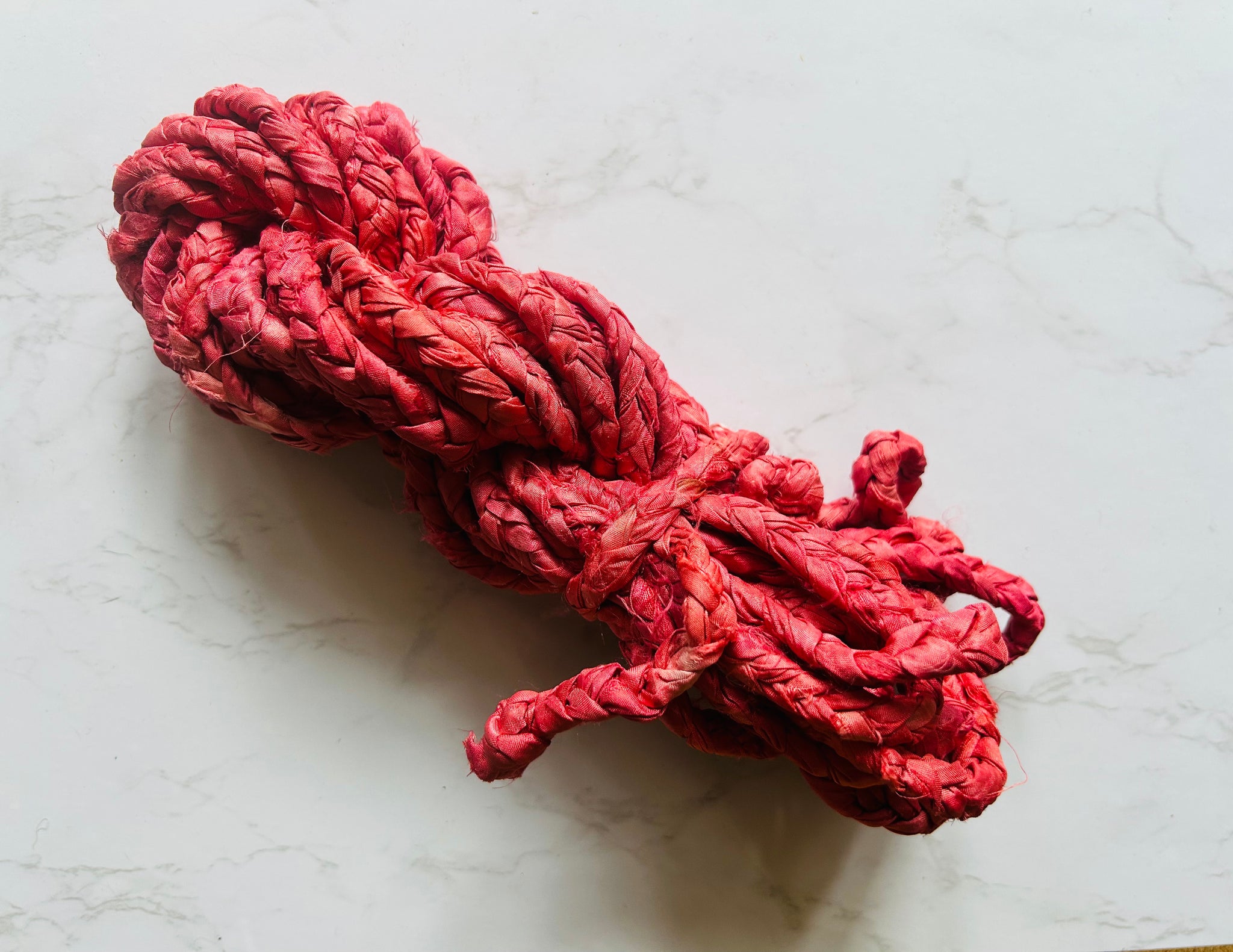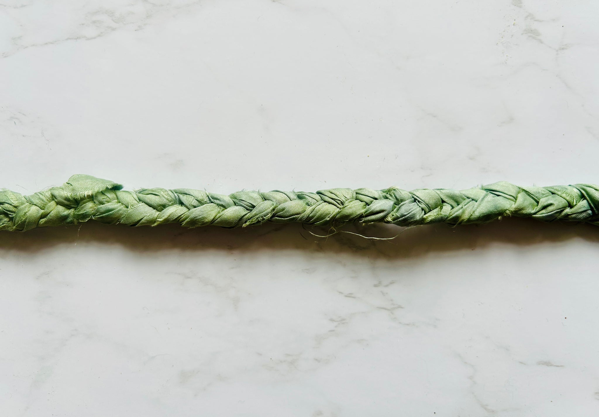 Upcycled sari silk, made into ribbon and then braided by hand into 5 metre rope lengths and dyed in small batches, with only natural colour, derived from plants.
